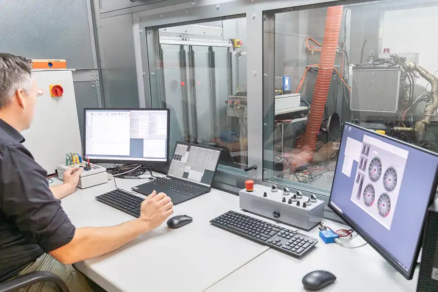 Ein firmeneigener Motorprüfstand steht für die Abstimmung, Optimierung und Prüfung von Verbrennungsmotoren bereit. Hier werden reale Bedingungen simuliert, um Hardware, Software und Regelstrategien perfekt abzustimmen. Dank Schnellwechselträger können hier auch kurzfristig einfache Tests vorgenommen werden – schnell, unkompliziert und kosteneffizient.
